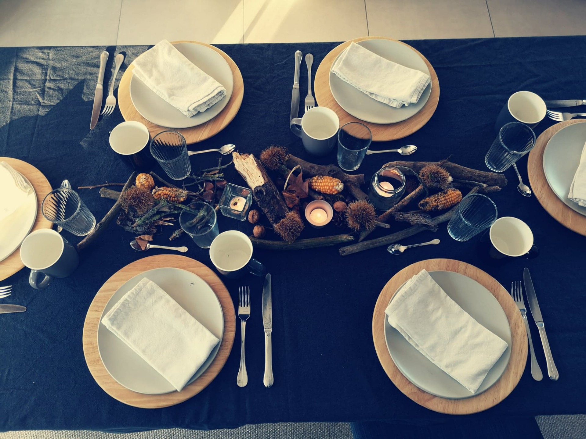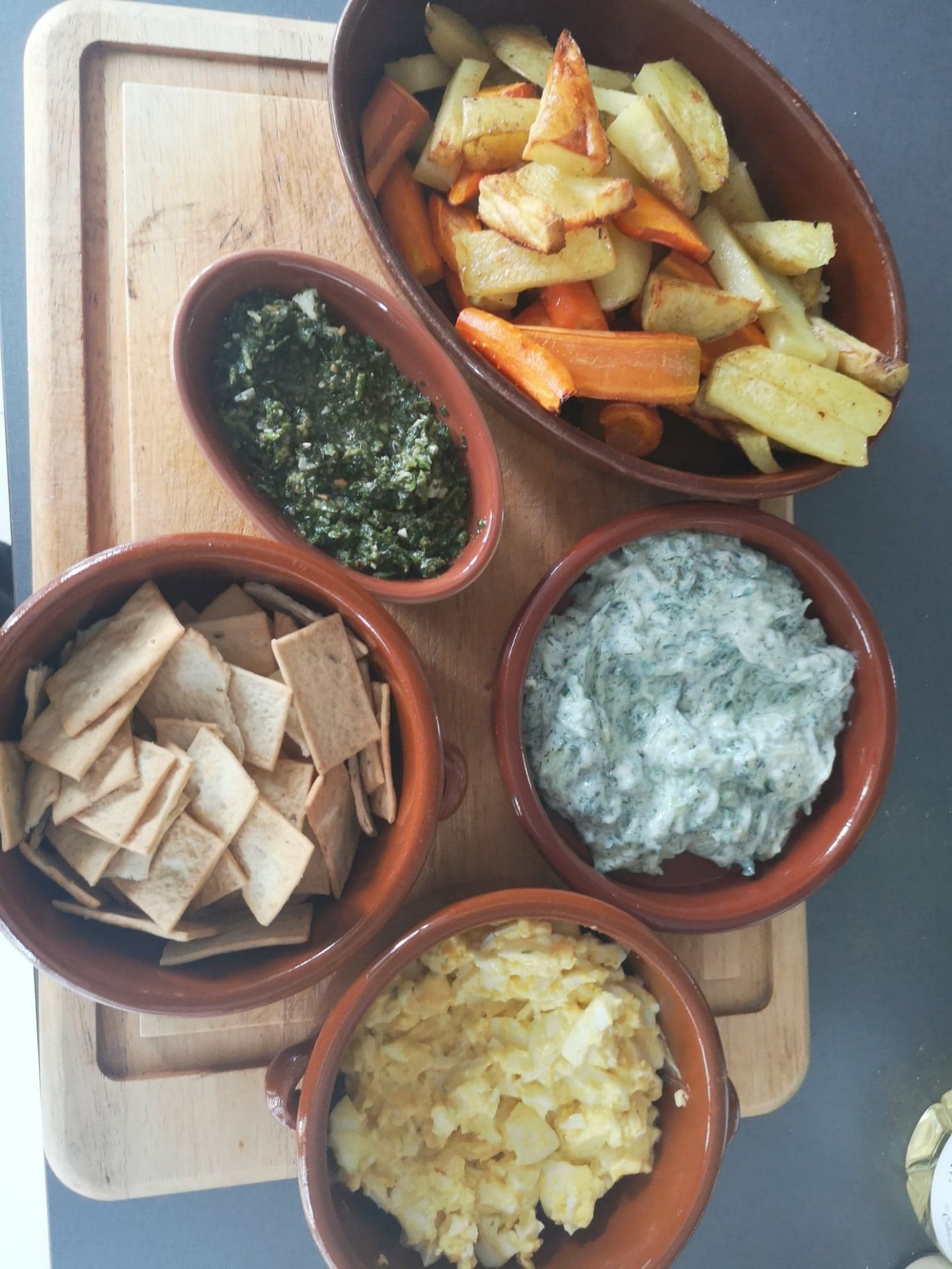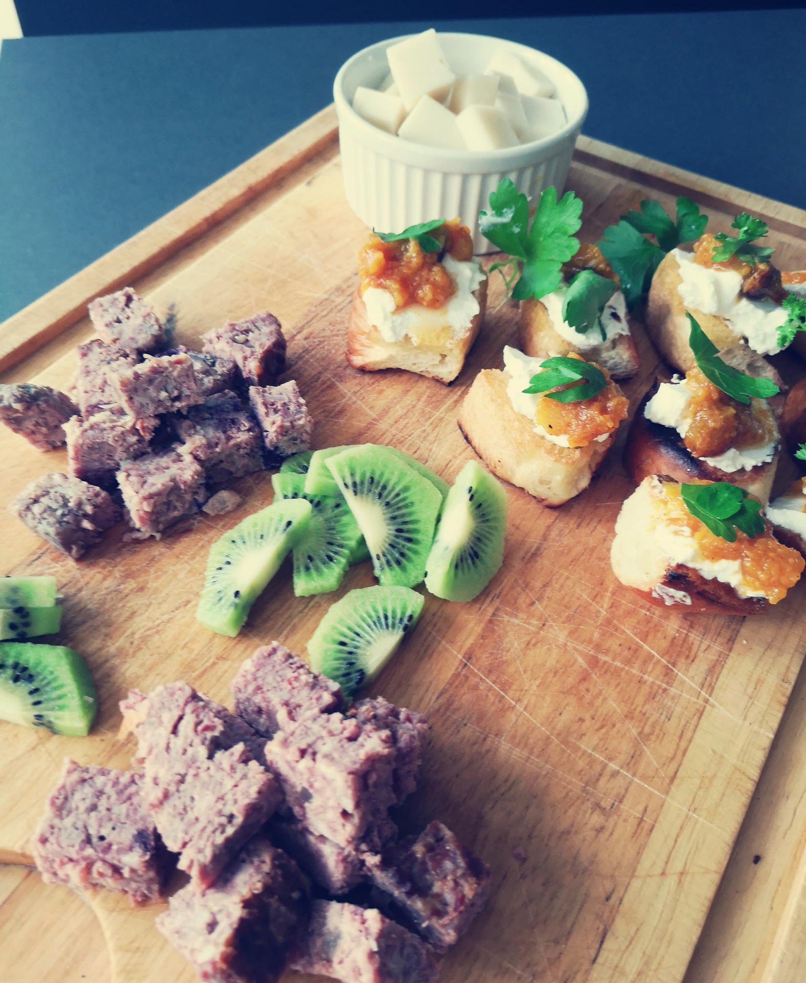 Een plankje vol lekkers: blokjes geitenkaas, 2 soorten terrines (hert - haas), gebakken mastel met schapenkaas-chutney