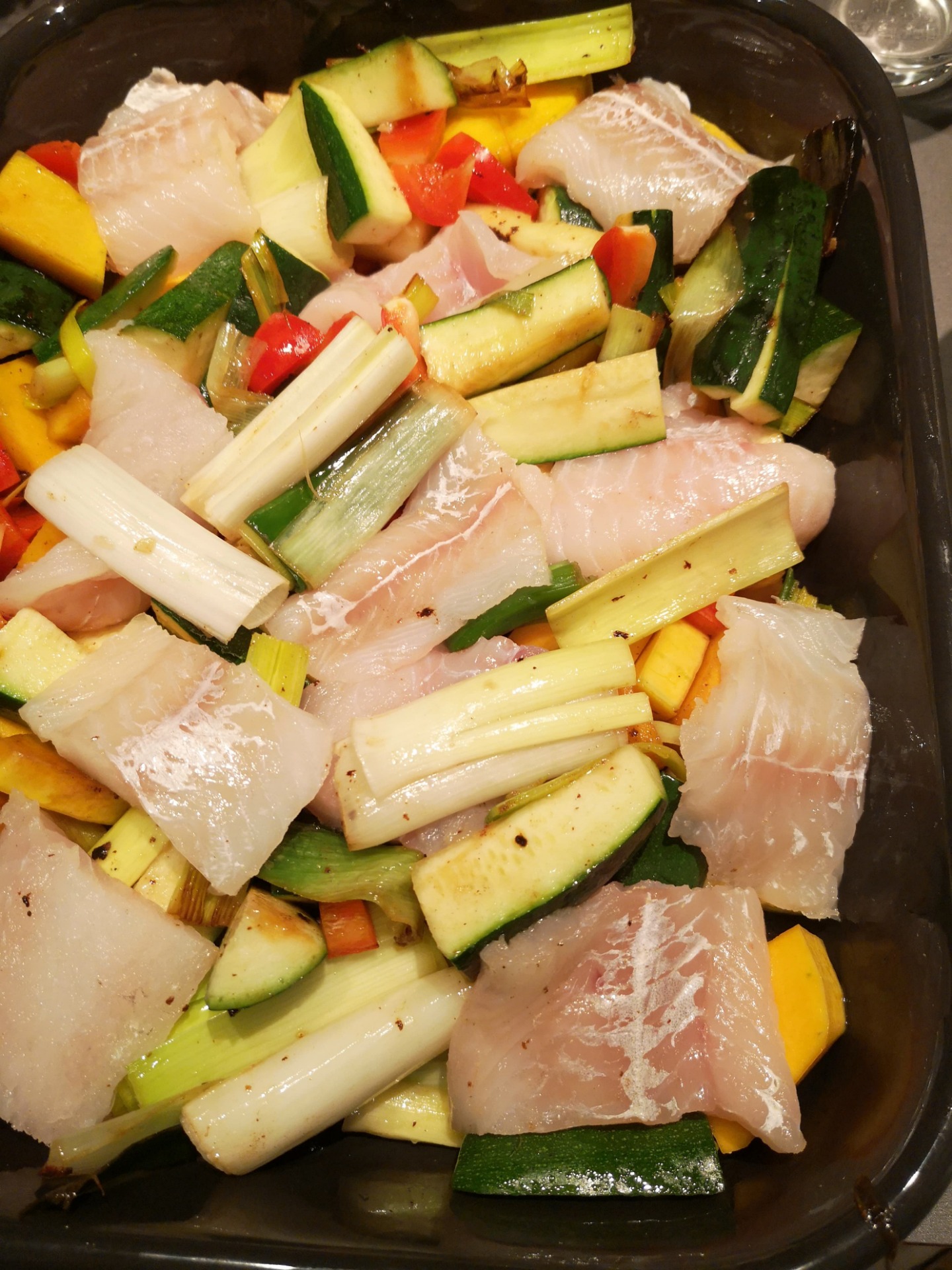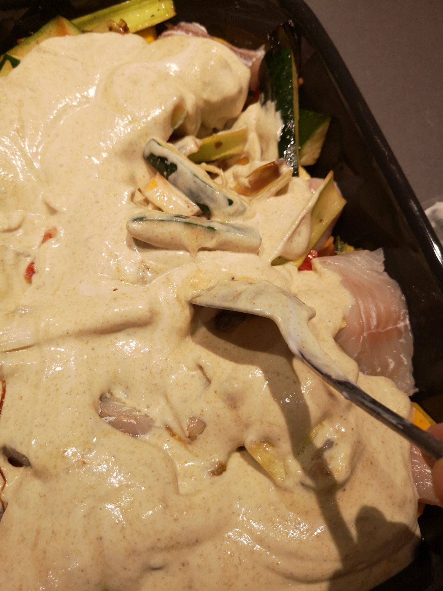 De groentjes snij ik in dikkere repen of blokjes, en stoof kort aan in olijfolie, kruiden met wat zout. Alles gaat in een ovenschotel. De vis wordt erop verdeeld. Het geheel wordt overgoten met een mengeling van yoghurt en groene curry. Wat mengen. En de oven in op 180°C, ong 15 minuten.